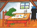 impressionner par ce détail. Il ne sait pas écrire mais il dessine très bien. De retour chez lui, il fait un superbe dessin qu'il peint en bleu et en rouge. Il ajoute un peu de vert, sa couleur préférée. |